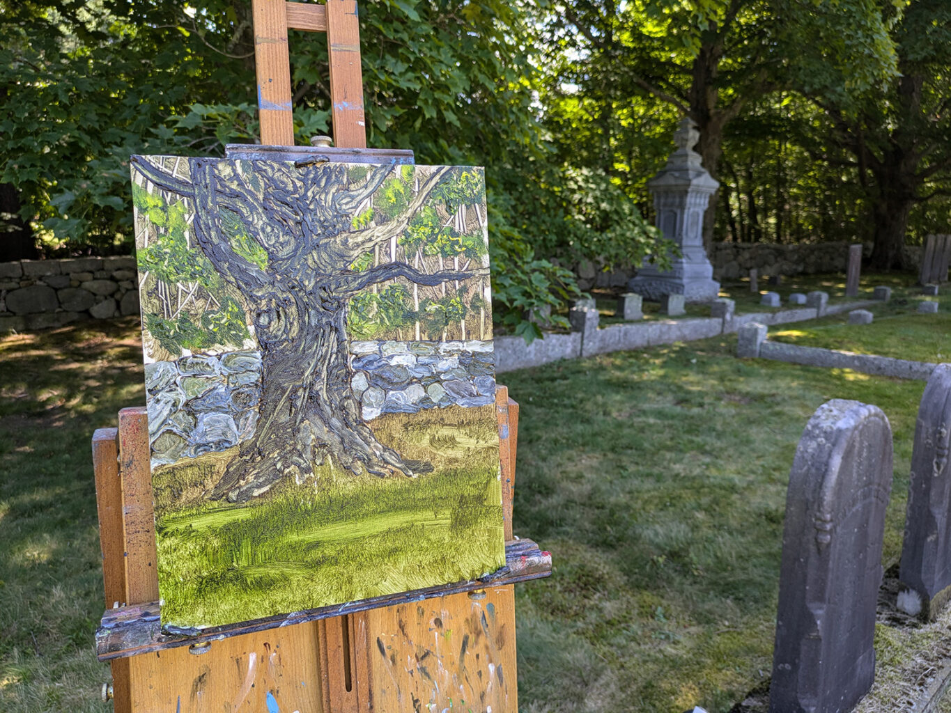 Marc and I were drove the the Big Apple in Wrentham looking for something to paint. We drove around for about and couldn’t find anything that inspired us. We eventfully found those old cemetery. I’ve been into painting trees lately. I had thought of trees as these living things that did not move but if you look at the pattern within the bark of a tree you can see that trees are constantly moving just very very slowly. The patterns in the bark of a tree are totally wild if you take a close look. I found this great tree with a stone wall behind it – two of my favorite things. I used to eat lunch with someone at work who said all it takes in one phone call to change your life. I got one of those calls that day. I laid down and stared at the sky for awhile before I told Marc the story. Its funny but while I’m typing this the person who called me just texted me.